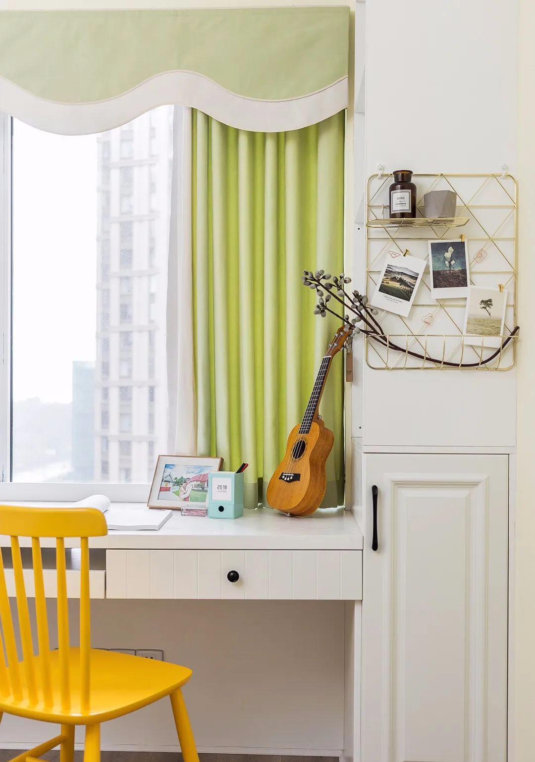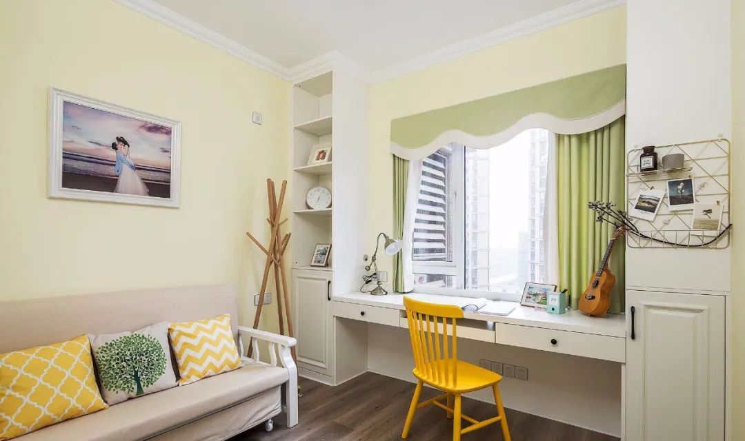 ▲ 靠窗的書桌和收納柜一體定制,實用性強,整體感好。金色鐵件墻飾的點綴,精致且實用。