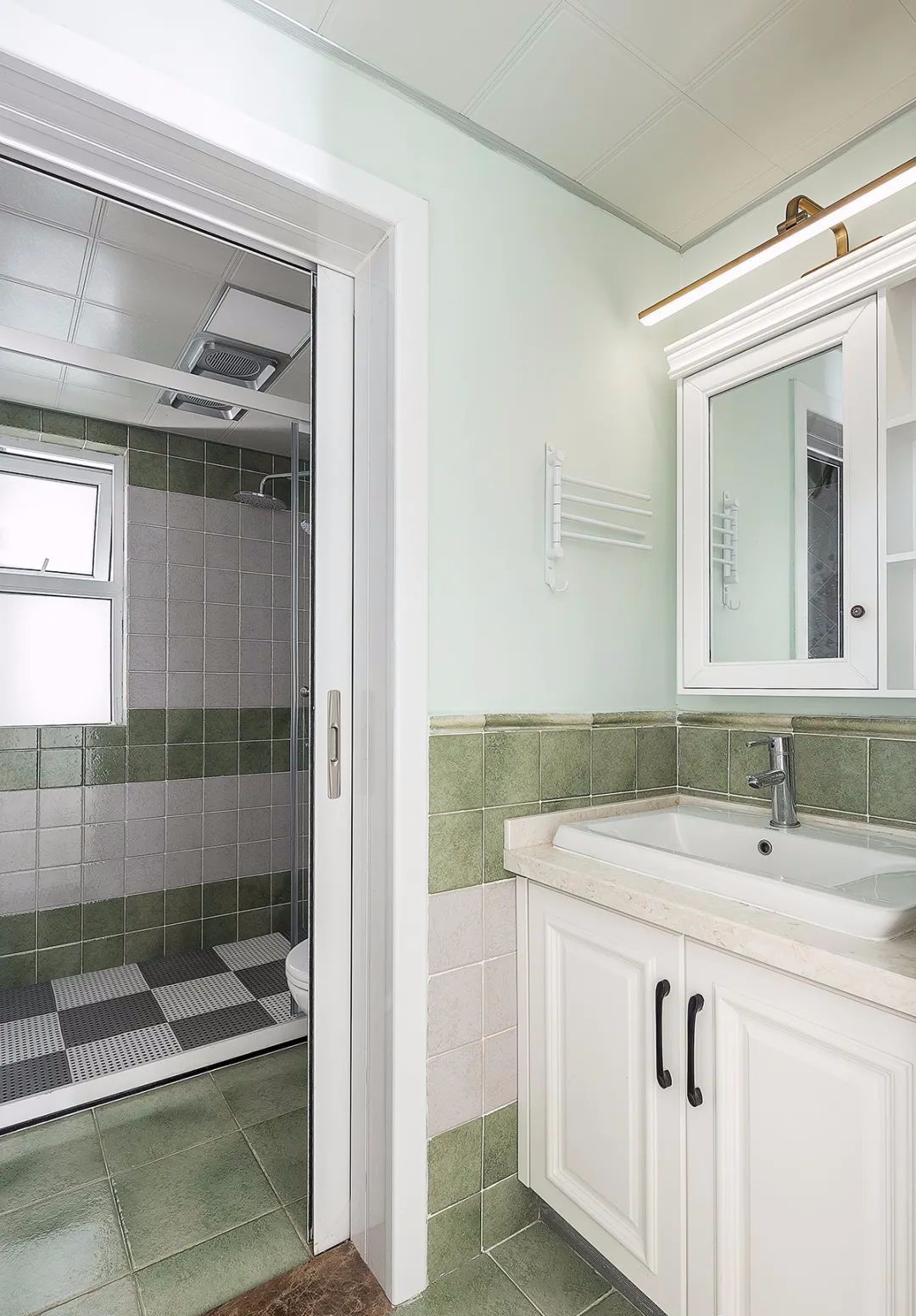 ▲ 干濕分離的衛生間,提高了使用的舒適性。綠色的地磚,呼應了整體的自然清爽格調。