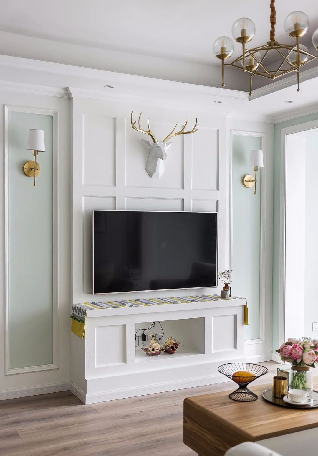 ▲ 電視背景設計對稱造型,中間打造一體式背景,金色元素燈飾與墻飾貫穿公領域空間。